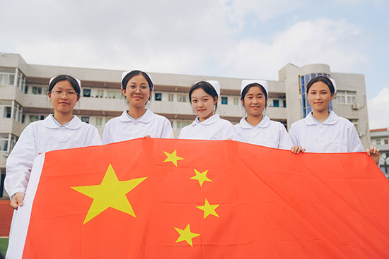 同學們身著潔白無暇護士服,頭戴神圣燕尾帽,象征崇高、純潔的護士服與鮮艷的五星紅旗色彩對照鮮明,既表達對祖國的崇高致敬,更象征著在國旗的照耀下,同學們的夢想展翅翱翔。(吳彥 胡佳)