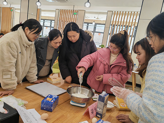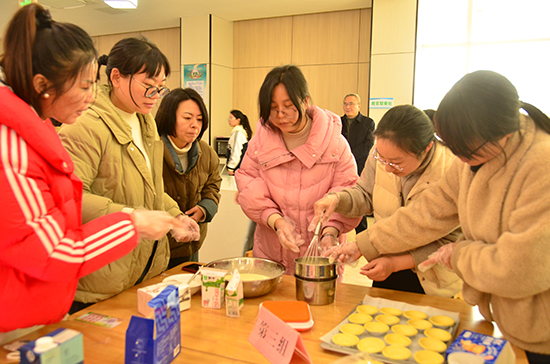 活動(dòng)現(xiàn)場(chǎng),7位女教師組成一組,她們配合默契,分工明確。首先,她們拿出現(xiàn)成的蛋撻皮,整齊地?cái)[放在烤盤(pán)上。接著,她們開(kāi)始制作蛋撻餡料。新鮮的雞蛋、牛奶和適量的白糖在她們的巧手下被攪拌均勻,逐漸變得細(xì)膩而均勻,散發(fā)出濃郁的奶香和蛋香。