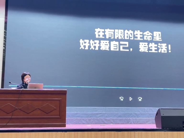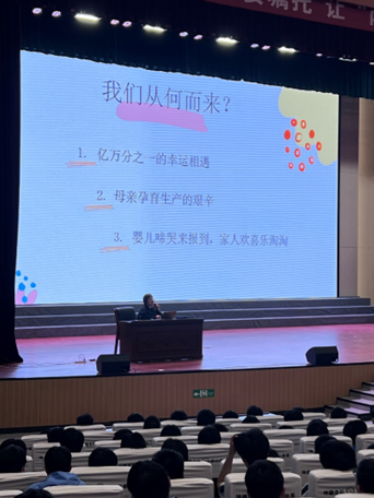 講座伊始,一個展現(xiàn)各種生命歷程的視頻吸引了大家的視線。在舒緩輕快的音樂中,從新生兒到100歲老人的面孔一一呈現(xiàn),每一次心跳、每一次呼吸都是生命的饋贈,讓同學們真切感受到成長的力量、生命的可貴:在有限的生命里,好好愛自己,愛生活!
