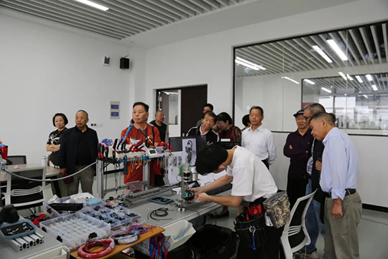 考察組參觀了校園工程建設沙盤展示區(qū)、模具智能制造產(chǎn)線、電控設備、數(shù)字孿生等多個工學一體化學習工作站,以及第47屆世界技能大賽可再生能源項目的中國隊集訓基地。