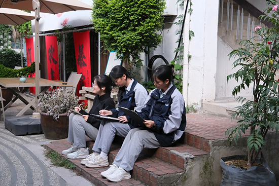出發(fā)前曹老師細致指導,學生帶著作畫工具,滿懷期待地走進新市古鎮(zhèn)。學生們各自尋找心儀地點,選取角度,開始構圖作畫。