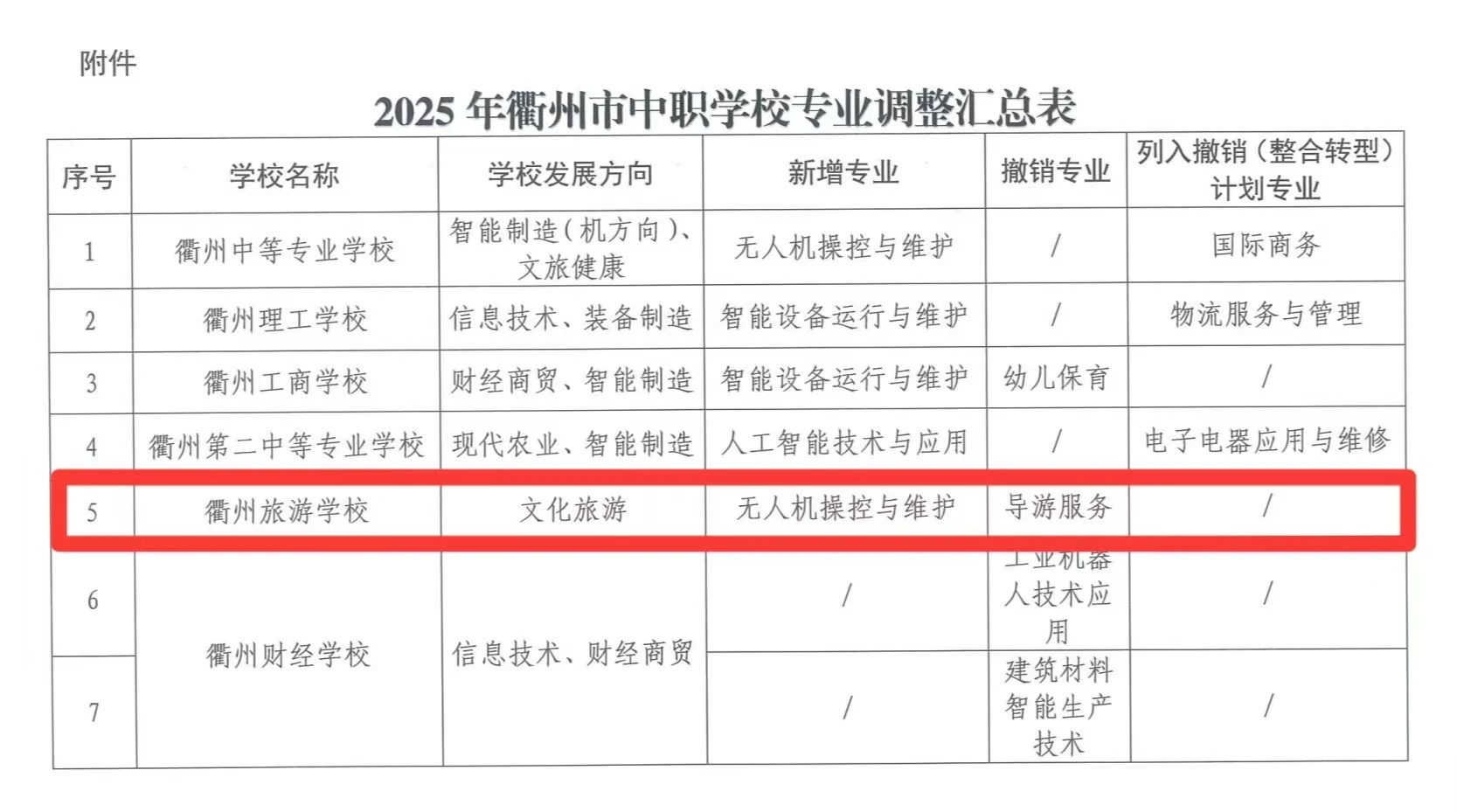 2月20日,衢州市教育局下發(fā)了《關(guān)于公布2025年衢州市中職學(xué)校專業(yè)調(diào)整結(jié)果的通知》(衢教〔2025〕5號)文件,浙江省衢州旅游學(xué)校成功新增無人機(jī)操控與維護(hù)專業(yè)。