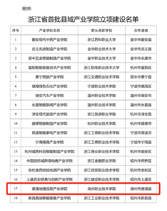 近日,浙江省教育廳公布首批縣域產(chǎn)業(yè)學院立項建設名單,全省共計27個立項單位,德清地理信息產(chǎn)業(yè)學院憑借扎實的產(chǎn)教融合基礎和創(chuàng)新的校企協(xié)同育人模式成功入選(湖州唯一)。德清地理信息產(chǎn)業(yè)學院由湖州職業(yè)技術(shù)學院與德清人民政府、德清職業(yè)中專及德清60余家龍頭企業(yè)合作共建。