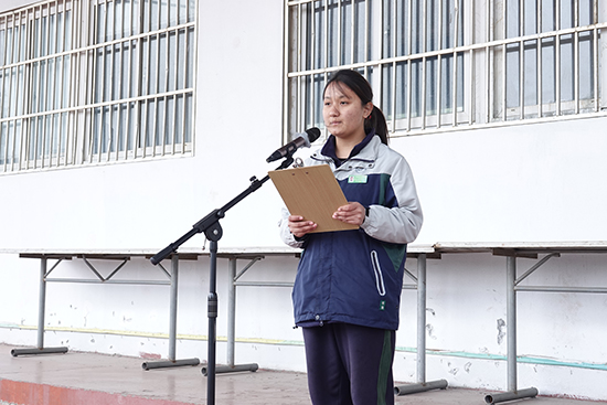高一26班的來孜娜?木熱阿力木作為學(xué)生代表上臺發(fā)言。她分享了先烈們?yōu)槔硐胄拍钌嵘赖挠⒂率论E,她呼吁同學(xué)們,要以先烈為榜樣,珍惜當(dāng)下的和平與安寧,努力學(xué)習(xí)知識,為實現(xiàn)中華民族偉大復(fù)興的中國夢貢獻力量。
