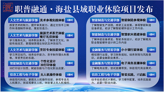 為推進(jìn)“職業(yè)啟蒙”教育,推動(dòng)職業(yè)理念、職業(yè)技能、職業(yè)素養(yǎng)與普通教育相互融通,海鹽職業(yè)教育中心特組織開展2025年度“職普融通示范日”活動(dòng)。
