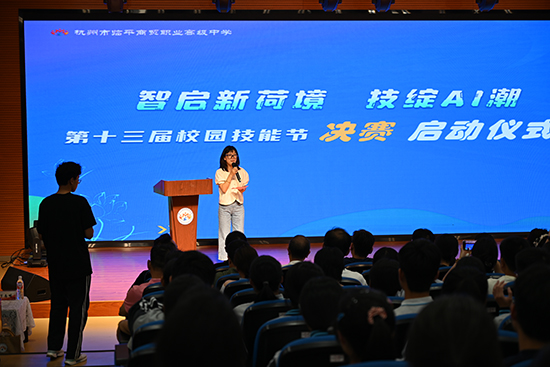 本屆技能節(jié)開幕式當(dāng)天在學(xué)校小劇場(chǎng)拉開序幕,臨平區(qū)第一幼兒園副園長(zhǎng)李玨;臨平區(qū)教育發(fā)展研究學(xué)院辦公室主任、教研員周黎霞,教研員馮國(guó)民;杭州博翱教育咨詢有限公司總經(jīng)理李曉東;杭州格越教育科技有限公司總經(jīng)理任磊;杭州妙道科技有限公司總經(jīng)理丁志明;余杭國(guó)際旅行社總經(jīng)理孫亮;浙商開元名都酒店餐飲部經(jīng)理張李月;杭州市臨平商貿(mào)職業(yè)高級(jí)中學(xué)校長(zhǎng)沈琪、學(xué)校黨委書記邵曉舟,及學(xué)校領(lǐng)導(dǎo)班子、中層干部,家長(zhǎng)代表、學(xué)生代表齊聚一堂,共赴這場(chǎng)技能與夢(mèng)想交織的盛會(huì)。