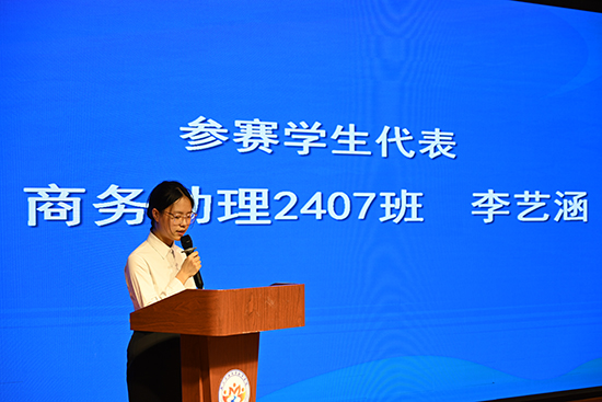 商助2407班李藝涵作為學(xué)生代表鄭重承諾,將以專業(yè)態(tài)度認(rèn)真參賽,以團(tuán)隊(duì)精神協(xié)作共贏,以賽事內(nèi)核提升自我,把賽場(chǎng)當(dāng)作未來(lái)職場(chǎng)的第一站!