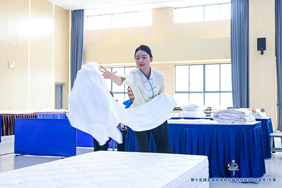 大賽分為三項(xiàng)內(nèi)容。其一為綜合知識(shí)理論考核,采用機(jī)考方式,時(shí)長(zhǎng)1小時(shí),滿(mǎn)分為100分,重點(diǎn)考察選手的專(zhuān)業(yè)理論基礎(chǔ)知識(shí)及綜合分析能力。其二是英語(yǔ)水平測(cè)試,本科院校和高職高專(zhuān)院校組時(shí)間約5分鐘,中職學(xué)校組時(shí)間約3分鐘,滿(mǎn)分為100分,通過(guò)選手與評(píng)委現(xiàn)場(chǎng)會(huì)話(huà),檢驗(yàn)選手的英語(yǔ)口語(yǔ)表達(dá)能力。其三為現(xiàn)場(chǎng)操作,其中的中式鋪床環(huán)節(jié),主要考察選手操作的熟練性、規(guī)范性。各項(xiàng)考核內(nèi)容全面且細(xì)致,旨在選拔出綜合能力過(guò)硬的旅游專(zhuān)業(yè)人才。