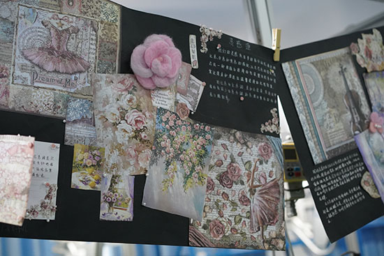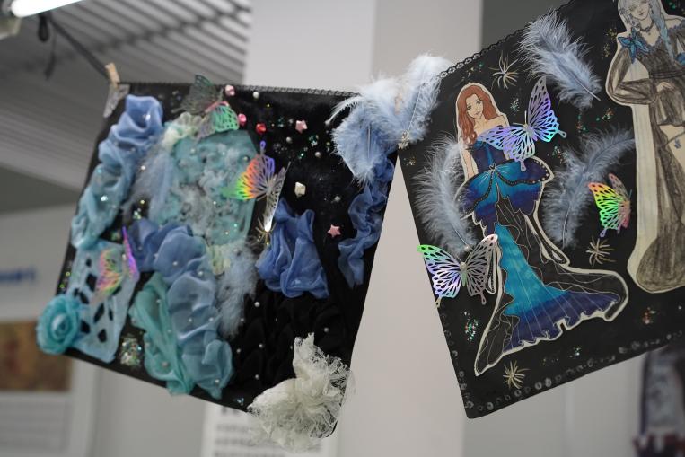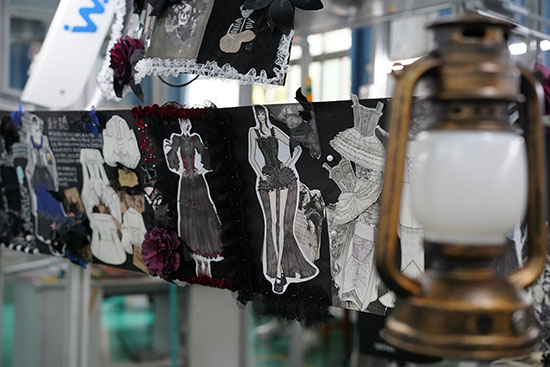秀場(chǎng)設(shè)在學(xué)校服裝實(shí)訓(xùn)樓,分兩場(chǎng)進(jìn)行,不少師生們趁著課余時(shí)間紛紛前來觀展。會(huì)場(chǎng)在服裝組老師和同學(xué)們精心布置下,一步一景,隨處可見匠心,一張張?jiān)O(shè)計(jì)圖紙記錄著同學(xué)們靈感的涌動(dòng)和心路歷程,人臺(tái)布景與同學(xué)們的手工創(chuàng)意制作相映成趣,更顯溫馨親切。
