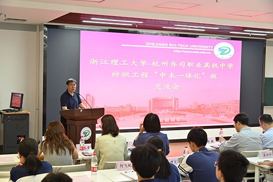 紡織科學(xué)與工程學(xué)院(國(guó)際絲綢學(xué)院)院長(zhǎng)于斌在講話中表示,學(xué)院高度重視與喬司職高的中本一體化教育合作,將在師資、課程建設(shè)等方面給予全面支持。“堅(jiān)定信心,珍惜當(dāng)下”,他介紹了紡織學(xué)科在全國(guó)、浙江省和學(xué)校的重要地位以及學(xué)??佳械惹闆r,提出,當(dāng)前大家把基礎(chǔ)學(xué)科學(xué)好是第一位的,在學(xué)歷貶值的背景下,大家要抓住機(jī)會(huì),腳踏實(shí)地,把目前在做的事情做到極致,今后自己也會(huì)感謝現(xiàn)在努力的自己。隨后,紡織科學(xué)與工程學(xué)院(國(guó)際絲綢學(xué)院)副院長(zhǎng)胡毅通過(guò)豐富的PPT資料,全面介紹了紡織專業(yè)、行業(yè)和產(chǎn)業(yè),讓師生們對(duì)紡織這個(gè)被譽(yù)為“上管天,下管地,中間管空氣”的學(xué)科有了形象清晰的認(rèn)識(shí)。
