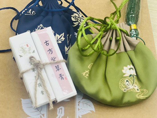 紫草香膏采用傳統(tǒng)配方,溫和滋潤;艾草薄荷膏清涼舒爽,在戶外受蚊蟲頻擾時可快速止癢,舒緩皮膚不適;而中藥香囊則采用五色絲綢材質,內裝艾葉、白芷、丁香等驅避五毒的天然藥材,綴以五色絲線流蘇,寓意祈福安康。香囊清香幽遠,可伴老師們伏案工作,提神醒腦。