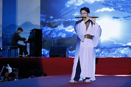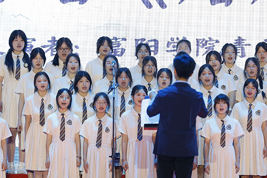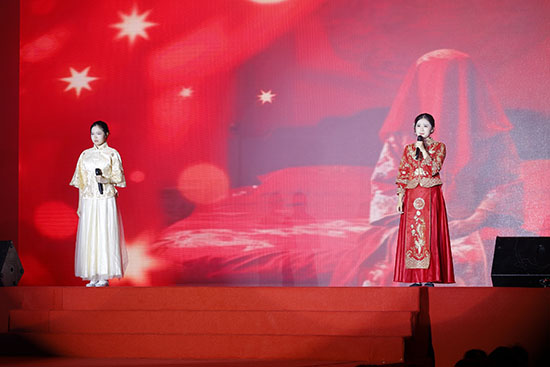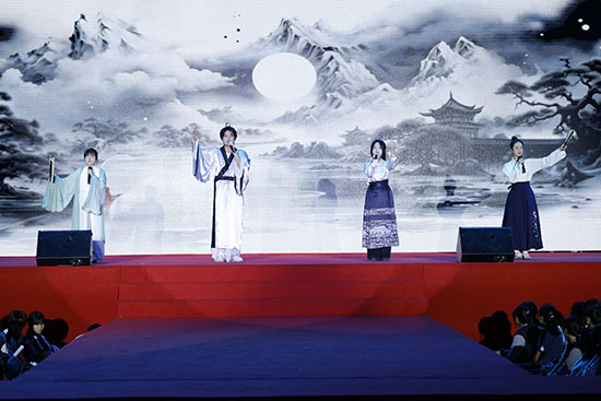 詩(shī)會(huì)在小組唱《富春山居圖》中拉開(kāi)了序幕。在富陽(yáng)學(xué)院大青校區(qū)操場(chǎng)上,舞臺(tái)燈光閃爍,照亮夜空,現(xiàn)場(chǎng)氣氛熱烈。整臺(tái)演出分三個(gè)篇章:文脈長(zhǎng)河 溯古吟風(fēng)、青云踏浪 志騁山海、薪火相傳 韻啟未來(lái),有詩(shī)朗誦《采薇》《執(zhí)火者》《中華詩(shī)韻映鼉江》《項(xiàng)脊軒志》《拜堂》《河床》《穿越時(shí)空的對(duì)話》《密碼》《戰(zhàn)歌嘹亮》《祖國(guó)到底是什么》,舞蹈《采茶姑娘》《蓮鼓越歌行》,兒童劇《沒(méi)有牙齒的大老虎》、器樂(lè)聯(lián)奏、歌曲聯(lián)唱、大合唱《熠熠的光》等17個(gè)節(jié)目。富陽(yáng)區(qū)知聯(lián)會(huì)代表、杭州科技職業(yè)技術(shù)學(xué)院學(xué)生、杭州市閑林職高學(xué)生應(yīng)邀參加演出。