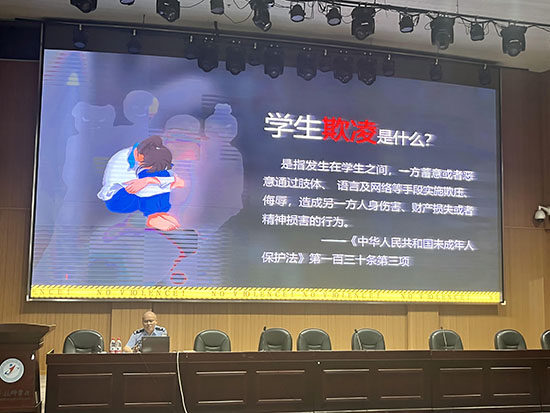 會(huì)議結(jié)束后,宣講員、公安局法制大隊(duì)副大隊(duì)長(zhǎng)葉斌在諸暨技師學(xué)院報(bào)告廳就校園防欺凌作示范講課。全體參會(huì)人員及技師學(xué)院200余名同學(xué)聆聽(tīng)了宣講。