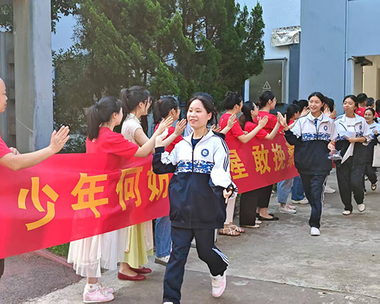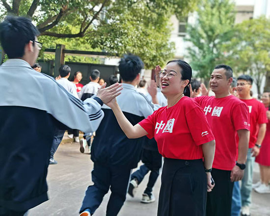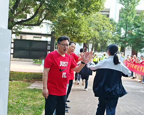 擊掌儀式現(xiàn)場,老師們高聲吶喊“沉著應(yīng)考,金榜題名”“你們是最棒的”,學(xué)生們則信心滿滿,以燦爛的笑容和堅定的目光回應(yīng)師長的期待。紅色的身影與青春的笑顏交織,成為校園里最動人的風(fēng)景。