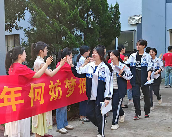 6月7日上午7:20,衢州第二中等專業(yè)學(xué)校校園內(nèi)涌動著一片紅色暖流。校領(lǐng)導(dǎo)與高三教師們身著印有“加油100分”的紅色T恤,部分女教師還特意換上寓意“旗開得勝”的旗袍,在高三教學(xué)樓下整齊列隊,與即將奔赴考場的高三學(xué)子一一擊掌,送上真摯的祝福與鼓勵。