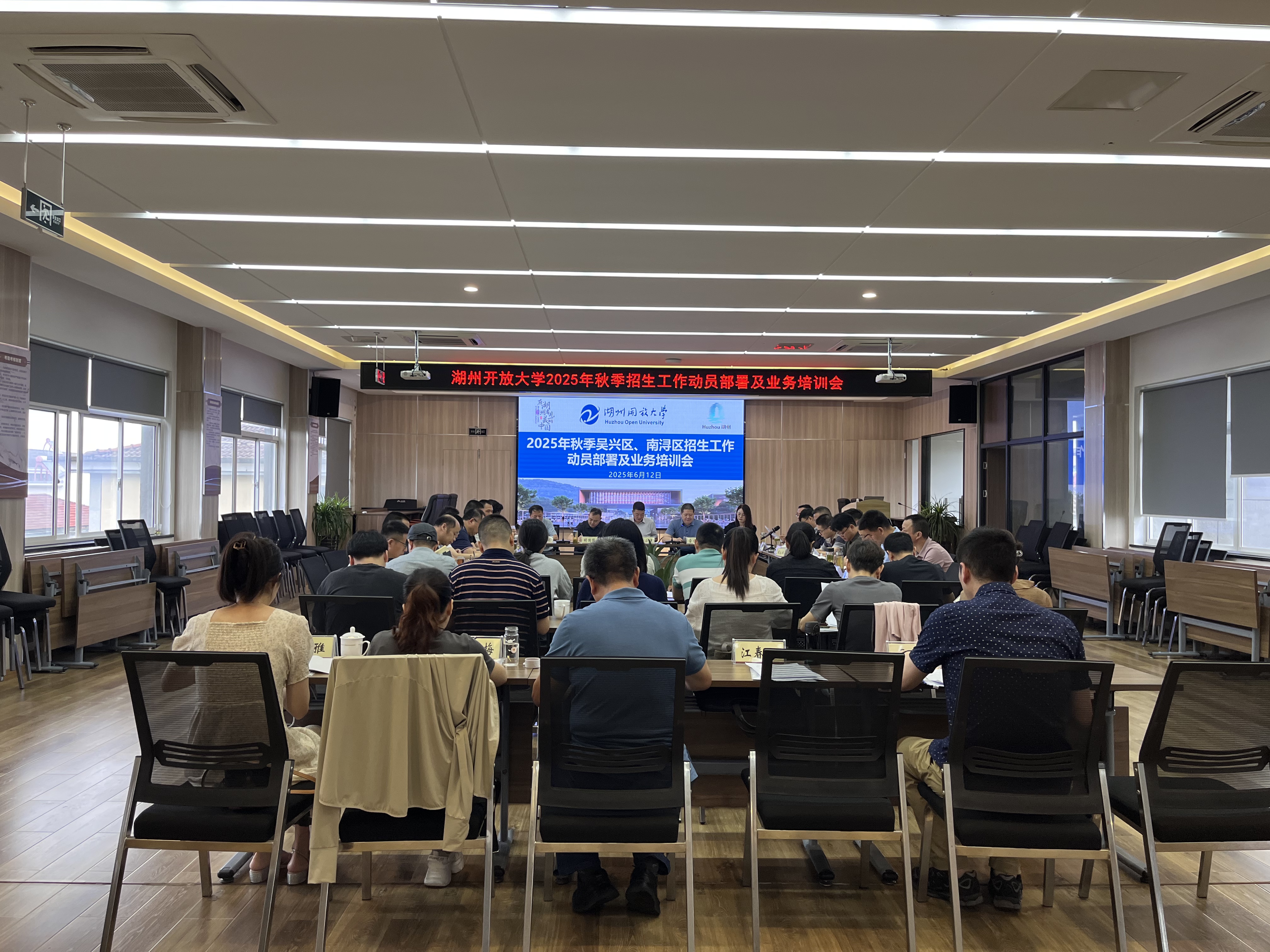 2025 年 6 月 12 日,一場關乎湖州開放教育發(fā)展新征程的重要會議 —— 湖州開放大學 2025 年秋季招生工作動員部署及業(yè)務培訓會,在和孚成校拉開帷幕。湖州開放大學吳小健副校長、繼續(xù)教育學院雷術海院長,吳興區(qū)教育局職成教中心主任胡國強、南潯區(qū)社區(qū)教育學院副院長李小鳳,以及市本級 18 所成校校長與招生負責人等 41 位教育工作者齊聚一堂,共商招生發(fā)展大計。?
