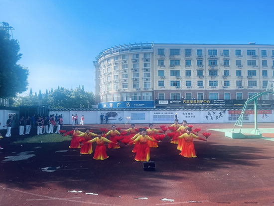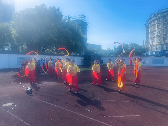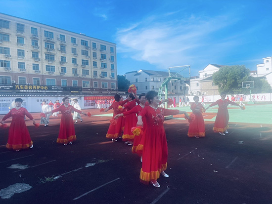 楓之韻藝術(shù)團(tuán)團(tuán)長(zhǎng)駱幼君帶著成員合著節(jié)拍跳起快樂(lè)舞步健身操,在激情的音樂(lè)聲中隊(duì)員們做著韻律的動(dòng)作,舞動(dòng)輕盈的身姿,在場(chǎng)人員紛紛拿起手機(jī)拍照。邊上40多人的王冕太極拳隊(duì)擺起方陣展示二十四太極拳,隊(duì)員隨著典雅的音樂(lè)舒展身姿,宏大的陣式、劃一的動(dòng)作,展示出太極拳極大的魅力,還有四十二式、太極劍表演。那里,永寧兜球基地的隊(duì)員正在展示兜球技藝,10個(gè)球在隊(duì)員手中嫻熟地拋入網(wǎng)兜中,贏得周邊人員的陣陣喝彩。那邊,柔力球的隊(duì)員正在球網(wǎng)兩邊角逐,那個(gè)球聽(tīng)話似在手拍中舞動(dòng),種種技巧展示出隊(duì)員們熟練的動(dòng)作。每個(gè)場(chǎng)地上到處洋溢著歡笑聲。最熱鬧的當(dāng)數(shù)舞蹈場(chǎng)地,海角社區(qū)舞蹈隊(duì)、樓家社區(qū)舞蹈隊(duì)、馬嶺村舞蹈隊(duì)、新東塢村舞蹈隊(duì)、百樹(shù)社區(qū)舞蹈隊(duì)、樂(lè)山村舞蹈隊(duì)、東三姐妹舞蹈隊(duì)及楓橋夕陽(yáng)紅舞蹈隊(duì),每支隊(duì)的隊(duì)員們好像憋著一股勁,不是比賽卻勝似比賽,爭(zhēng)奇斗艷,都拿出自己的看家本領(lǐng),不顧天氣炎熱,身著盛裝合著音樂(lè)的節(jié)拍舞動(dòng)矯健的身姿,展示不同的舞種,在不同的音樂(lè)風(fēng)格,充分展示自己的風(fēng)采,贏得在場(chǎng)人員紛紛拍照、鼓掌,每一個(gè)場(chǎng)地都體現(xiàn)“我運(yùn)動(dòng) 我健康 我快樂(lè)”。