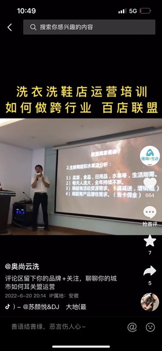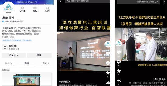 朱溪鎮(zhèn)社區(qū)學校通過與臺州奧尚科技有限公司等企業(yè)合作,拓寬培訓資源,為學員們介紹智能洗衣,解決傳統(tǒng)干洗店無法提供“24小時”服務的弊端,強化村民市場運營觀念和能力。同時朱溪鎮(zhèn)社區(qū)學校與臺州市奧尚科技有限公司攜手成立校外培訓實踐基地,增設實體店體驗項目、運營實習項目以及加盟連鎖幫扶項目,三大項目有效的提升了培訓實效。2022年,雙方加深協(xié)作,為洗染行業(yè)提供線上線下技能與運營培訓,同時打造抖音“浙江洗衣洗鞋,浙里洗”線上平臺獨立入口,為洗染行業(yè)經(jīng)營戶提供線上抖音直播培訓培訓和運營幫扶服務,突破傳統(tǒng)行業(yè)服務店鋪周邊2公里的業(yè)務局限,不斷向全省市拓展,甚至服務全國業(yè)務。如圖所示:共富課堂奧尚云洗培訓抖音直播。