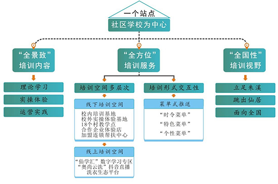 全景式:一是“全景致”培訓內(nèi)容:涵蓋理論學習,實操體驗,運營實踐等從學習到實踐到運營一整套培訓內(nèi)容。解決不會學問題。二是“全方位”培訓服務:1.培訓空間多層次(線下培訓空間包括校內(nèi)培訓基地、校外實操體驗基地、18個村教學點,合作企業(yè)體驗店,加盟連鎖幫扶中心。線上培訓空間包括浙里辦“仙學匯”數(shù)字學習專區(qū)、“奧尚云洗”抖音直播、洗衣生態(tài)平臺等)2.培訓形式交互性(菜單式推送:“時令菜單”、“個性菜單”、“特色菜單”;雙選式擇課:我推—你選;你點—我送)。解決不便學與不愿學問題。三是“全國性”培訓視野:立足朱溪、跳出仙居、面向全國。