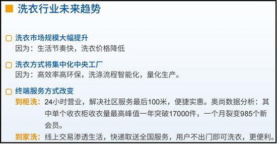 (二)淘汰落后工藝,開發(fā)洗護生態(tài)平臺。傳統(tǒng)門店從業(yè)者基本以技術型人才為主,對營銷軟件工具認識相對較低。通過與臺州市奧尚科技有限公司結(jié)對合作,從運營技術管理上全面培訓指點學員。開發(fā)洗護生態(tài)平臺,實現(xiàn)平臺下的同業(yè)和異業(yè)商戶互相合作,各自獨立經(jīng)營,財務獨立,同時可以共享C端客戶資源,運營上大大降低了獲客成本。為行業(yè)帶來最大的創(chuàng)新亮點是為全國傳統(tǒng)洗護門店低門檻進入轉(zhuǎn)型互聯(lián)網(wǎng)化,基于奧尚平臺運營,為傳統(tǒng)洗護門店收發(fā)管理,24小時智能收發(fā)柜,線上到家快遞取送洗衣服務,洗衣工廠管理系統(tǒng)和門店,智能柜,合作門店,產(chǎn)品商城以及線上運營公司無縫對接。