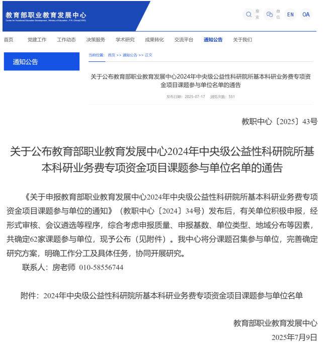 教育部職業(yè)教育發(fā)展中心2024年中央級(jí)公益性科研院所基本科研業(yè)務(wù)費(fèi)專項(xiàng)資金項(xiàng)目課題參與單位名單的通告