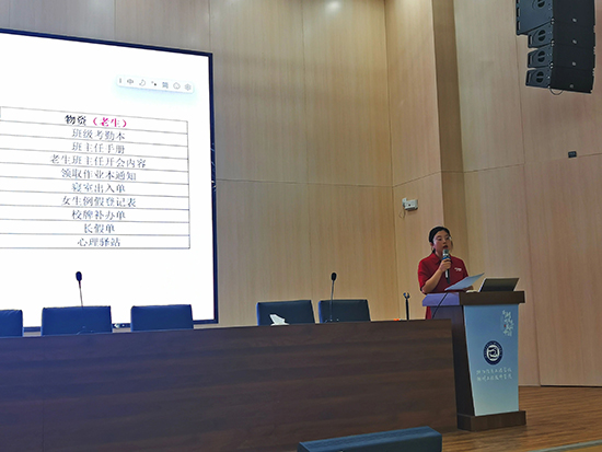 學(xué)生處處長楊育萍就開學(xué)新生報(bào)到流程、物資領(lǐng)取發(fā)放、軍訓(xùn)事項(xiàng)安排等做詳細(xì)解讀,同時(shí)布置了新學(xué)期開學(xué)的主要工作任務(wù),強(qiáng)調(diào)了班主任工作的重要性,從開學(xué)報(bào)到、家訪安排、儀容儀表、宿舍管理、校園安全等方面對(duì)班主任提出具體要求,要求班主任樹立信心,打開思路,明確方向,豐富德育途徑,創(chuàng)新工作方法。