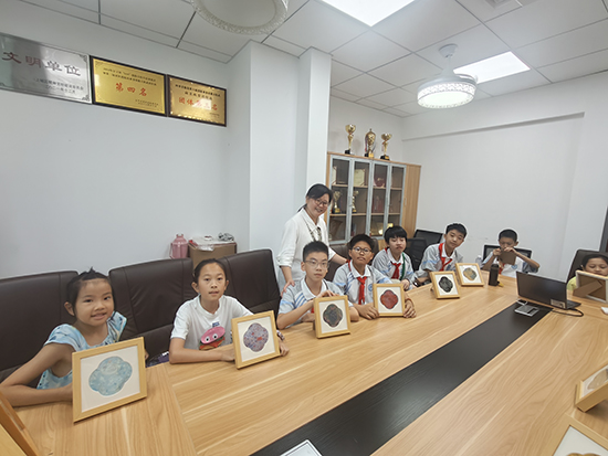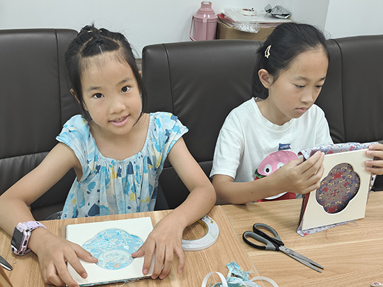 沉浸式研學(xué)過后,我又組織大家開展宋錦面料裱畫活動。孩子們小心翼翼地拿起宋錦面料,按照步驟搭配、固定,將一塊塊帶有傳統(tǒng)紋樣的面料,慢慢變成一幅幅精致的工藝作品。制作過程中,他們對宋錦的質(zhì)感、紋樣有了更真切的感知;當(dāng)親手完成的作品擺在眼前時,每個人臉上都洋溢著滿滿的自豪。