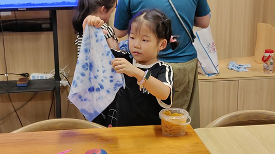 非遺扎染活動同樣精彩。志愿者向青少年介紹扎染的歷史淵源與“捆扎防染”的基本原理,演示折疊、捆扎、染色等關(guān)鍵步驟。孩子們躍躍欲試,用皮筋將白布扎出不同花紋,再放入染料中浸泡。當(dāng)解開皮筋,看到白布上呈現(xiàn)出藍(lán)白相間、圖案各異的紋理時,大家紛紛驚嘆于扎染工藝的神奇,也在實踐中體會到傳統(tǒng)手工藝的匠心與智慧。