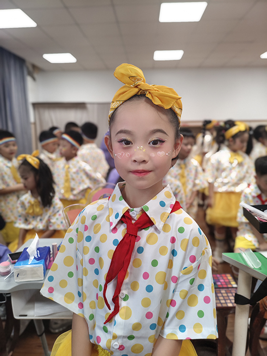 在高效協(xié)作之下,原本繁瑣的化妝工作進(jìn)展得非常順利。短短兩個(gè)小時(shí)不到,四十多名學(xué)生全部妝發(fā)完成,孩子們互相打量著彼此的新形象,眼神里洋溢著驚喜與自信。老師們也連連稱贊:“這么快又這么細(xì)致,真是幫了我們大忙!”