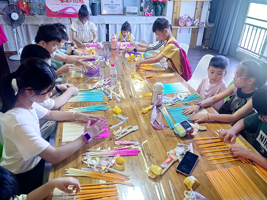 參觀結(jié)束,活動(dòng)迎來(lái)了備受期待的非遺手工體驗(yàn)環(huán)節(jié)——竹編扇子制作。本地非遺傳承人現(xiàn)場(chǎng)教學(xué),耐心細(xì)致地為孩子們傳授竹編的基本技法和創(chuàng)作要領(lǐng)。孩子們躍躍欲試,在老師專業(yè)指導(dǎo)和志愿者的協(xié)助下,親手將一根根纖細(xì)的竹篾編織成了一把把獨(dú)具匠心的小扇子。盡管手法初顯生澀,但每一件作品都凝聚著孩子們的專注與巧思?;顒?dòng)現(xiàn)場(chǎng)氣氛熱烈而歡快。光明領(lǐng)御小區(qū)的吳羽星小朋友興奮地說(shuō):“原來(lái)竹子可以變成這么漂亮的扇子!回家我一定要把今天學(xué)到的教給爸爸媽媽。”