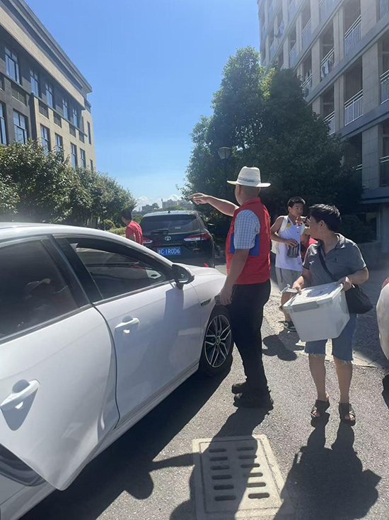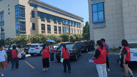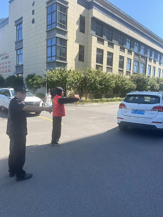下午2時,黨員志愿者們頂著酷暑抵達崗位,身著志愿馬甲,迅速進入工作狀態(tài)。在校園門口,黨員教師們分工明確:有的引導送學車輛即停即走、有序駛入指定停車場,避免校門口交通擁堵;有的主動上前,接過新生手中的行李箱、被褥等行李,幫著搬運行李;還有的駐守在校園主干道拐角處,耐心指引報到流程,為新生及家長答疑解惑,“同學,國防教育報到點往這邊走”“家長您好,舜華樓寢室在那邊,我?guī)^去”—— 一句句親切的指引、一個個忙碌的身影,成為校園里最溫暖的風景線。