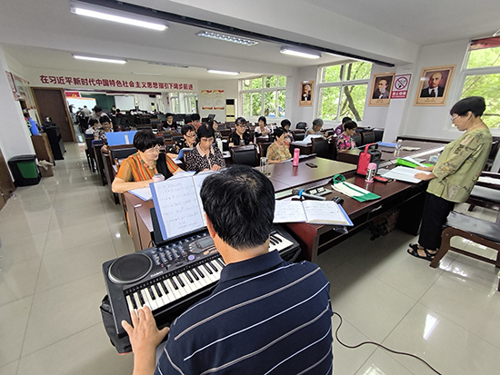 課程設(shè)計(jì)注重互動(dòng)性與趣味性。開班儀式上,學(xué)員們分組在伴奏下合唱紅歌。教師通過分步教學(xué),幫助零基礎(chǔ)學(xué)員快速掌握節(jié)奏和音準(zhǔn),并結(jié)合紅歌歷史背景講解,深化學(xué)員對(duì)革命精神的理解。例如,在《彈起我心愛的土琵琶》合唱環(huán)節(jié),電子琴的悠揚(yáng)琴聲與學(xué)員們的鏗鏘歌聲交融,營(yíng)造出感人至深的藝術(shù)氛圍。一位72歲的學(xué)員感慨道:“通過唱紅歌讓我重溫青春歲月,心里充滿力量!”。