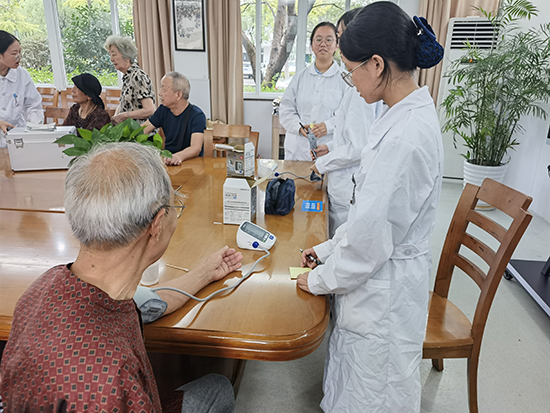 會(huì)議室,同學(xué)們分工協(xié)作,為退休教師們免費(fèi)測量血壓、血糖、血氧飽和度,詳細(xì)記錄健康數(shù)據(jù),并耐心詢問日常飲食、作息和用藥情況。針對退休教師存在的慢性病問題,同學(xué)們在指導(dǎo)老師王萍和羅丹的帶領(lǐng)下,進(jìn)行了個(gè)性化的健康宣教,普及健康知識(shí)。