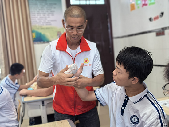理論講解結(jié)束后,實操練習隨即啟動。同學們兩兩一組,互相充當 “傷員” 進行包扎練習:從頭部環(huán)形包扎到手臂螺旋包扎,從腿部“8”字包扎到關節(jié)處的特殊包扎,大家認真模仿講師動作,不斷調(diào)整包扎松緊度,在實踐中熟悉操作要領。