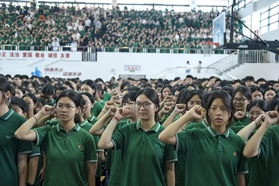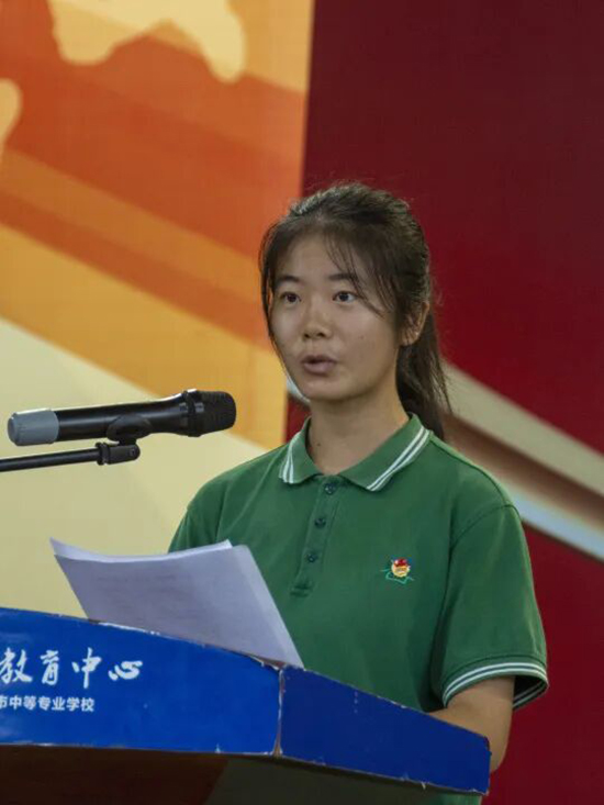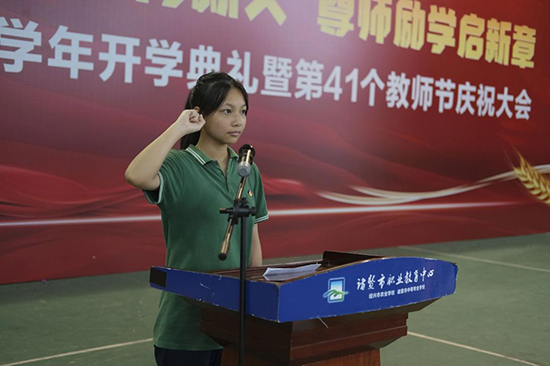 在入學(xué)宣誓環(huán)節(jié),23幼1班壽煜夢同學(xué)帶領(lǐng)全體同學(xué)莊嚴(yán)宣誓,錚錚誓言回蕩在體育館內(nèi),展現(xiàn)了職教學(xué)子的精神風(fēng)貌。