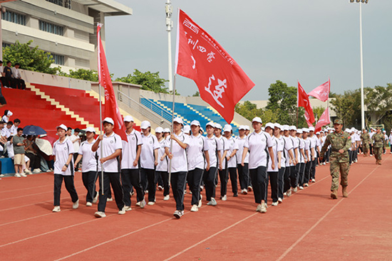 分列式展示環(huán)節(jié),各營方陣以整齊劃一的步伐、昂揚的姿態(tài)通過主席臺,接受校領導檢閱。