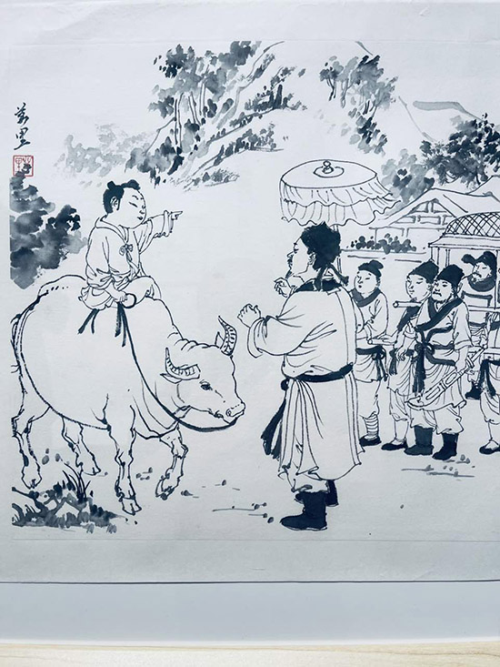 洪萬里以“楓橋三賢”——王冕、楊維楨、陳洪綬三位歷史人物為創(chuàng)作切入點,深得陳洪綬(號老蓮)遺風。其筆下的羅漢、八仙、達摩、和合二仙等人物畫,嫻熟運用陳洪綬所創(chuàng)“高古游絲描”,線條圓潤細勁、流暢連綿,如春蠶吐絲,盡顯古拙金石韻味。他以傳統(tǒng)筆法勾勒人物,形制高古奇駭,衣紋流轉(zhuǎn)自如,在傳承傳統(tǒng)白描精髓的同時,融入現(xiàn)代審美意趣,實現(xiàn)了古典題材與當代藝術(shù)精神的對話。畫作將地域名人故事與紅色文化娓娓道來,展現(xiàn)出深厚的文化底蘊與非凡的藝術(shù)創(chuàng)造力,既是對歷史的致敬,也是對人文精神的當代重構(gòu)。