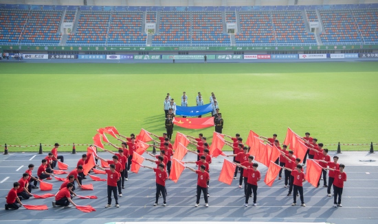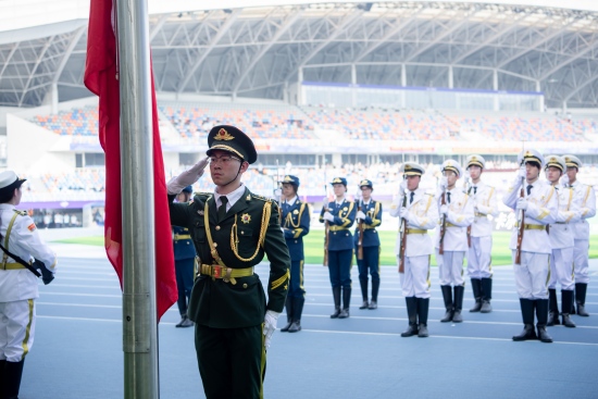 入場完畢后,全場肅立,升國旗,奏唱國歌,表達(dá)對祖國的崇高敬意!