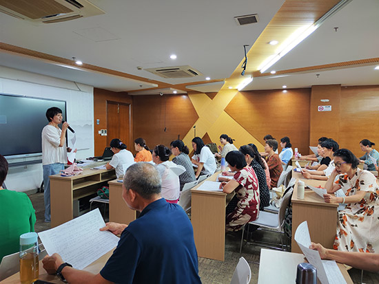 課程伊始,吳老師先讓學(xué)員們進行自我介紹、互相認(rèn)識,有基礎(chǔ)的學(xué)員還哼上幾句越劇,讓老師把把關(guān)看看基礎(chǔ),也惹得學(xué)員們開懷大笑,大家在歡聲笑語中破冰。本次課吳老師教的是《何文秀—心連心選段》,吳老師從基礎(chǔ)唱腔入手,逐字逐句指導(dǎo)學(xué)員把握音準(zhǔn)與節(jié)奏,同時示范經(jīng)典身段動作,如蘭花指、臺步等,耐心糾正細(xì)節(jié)姿勢。學(xué)員們神情專注,手持曲譜認(rèn)真跟練,時而輕聲哼唱,時而模仿身段,遇到疑問及時向老師請教,互動氛圍熱烈。