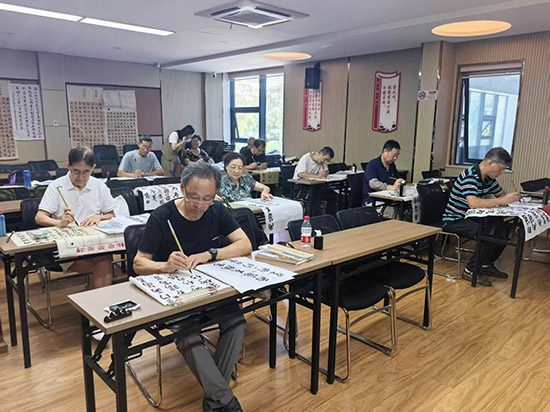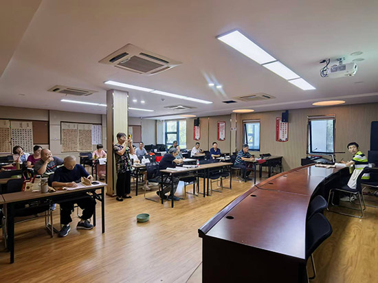 走進(jìn)各個(gè)教室,墨香、歌聲與歡聲笑語交織。書法課上尤為熱鬧,畢老師先笑著肯定了學(xué)員們的進(jìn)步:“大家之前的學(xué)習(xí)沒白費(fèi),進(jìn)步肉眼可見!”隨后,他結(jié)合學(xué)員們的《洛神賦》作品展開細(xì)致點(diǎn)評(píng),從墨色濃淡的層次感、字體收放的節(jié)奏感,到字與字間大小、疏密的對(duì)比關(guān)系,逐一進(jìn)行點(diǎn)評(píng)講解。學(xué)員們圍在一旁認(rèn)真傾聽,不時(shí)點(diǎn)頭記錄,遇到疑問及時(shí)提問,畢老師都耐心一一解答。點(diǎn)評(píng)結(jié)束后,畢老師拿起毛筆開始現(xiàn)場示范,從起筆的輕重、行筆的快慢到收筆的頓挫,每一個(gè)動(dòng)作都講解得清晰到位。學(xué)員們緊隨其后握筆臨摹,教室里瞬間安靜下來,只聽見筆尖劃過宣紙的沙沙聲。大家目不轉(zhuǎn)睛盯著字帖,一筆一劃認(rèn)真專注,遇到拿捏不準(zhǔn)的地方,便抬頭看看老師的示范,或是輕聲向身邊同學(xué)請(qǐng)教,沉浸在書法學(xué)習(xí)的樂趣中。