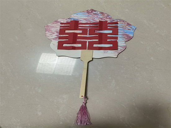 學(xué)員們熱情高漲,紛紛拿起剪刀嘗試。有的學(xué)員專注于傳統(tǒng)“喜”字的精準(zhǔn)裁剪,力求展現(xiàn)經(jīng)典紋樣的對稱之美;有的學(xué)員則大膽創(chuàng)新,將安吉本地的竹元素、山水元素融入花紋設(shè)計,讓“喜”字多了幾分地域特色。隨著剪刀的開合,一張張紅紙逐漸變成了造型各異的“喜”字,有的靈動飄逸,有的飽滿厚重。完成剪紙后,學(xué)員們小心翼翼地將“喜”字粘貼在素色扇面上,原本樸素的扇子瞬間煥發(fā)生機,紅色的“喜”字與扇面的素雅相得益彰,既保留了剪紙藝術(shù)的傳統(tǒng)韻味,又賦予了扇子文創(chuàng)產(chǎn)品的實用價值,真正實現(xiàn)了“傳統(tǒng)剪紙+現(xiàn)代文創(chuàng)”的完美融合。