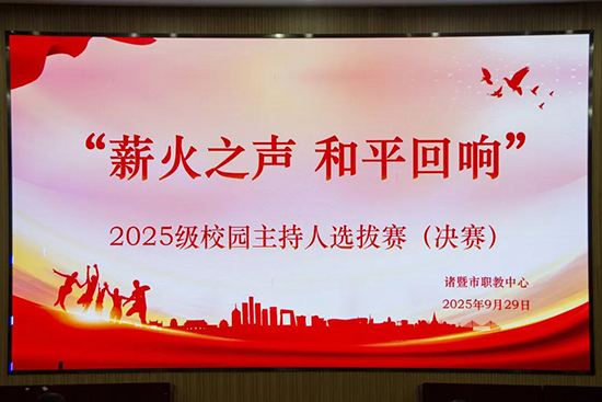近日,諸暨市職業(yè)教育中心2025級(jí)“薪火之聲 和平回響”校園主持人大賽決賽在校多功能廳圓滿舉行。經(jīng)過初賽選拔脫穎而出的10位選手在決賽中同臺(tái)競(jìng)技,最終,25長征1班樓億、25工美班蘭紫怡兩位同學(xué)憑借出色表現(xiàn)榮獲一等獎(jiǎng)。