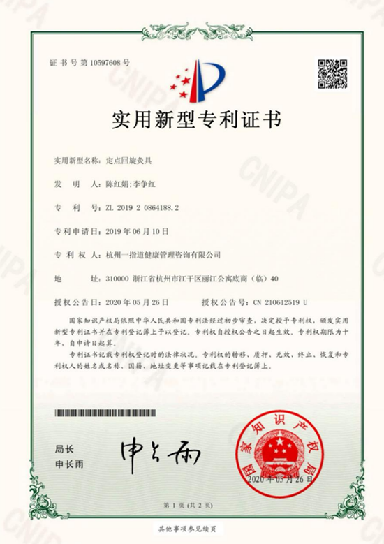 她勤修內功,加快推進古法艾灸的創(chuàng)新發(fā)展,有意識地進行傳統(tǒng)醫(yī)藥知識產權的保護。筧橋古法艾灸項目以祖?zhèn)靼瑮l配方、百字銘文、扶陽固本“四部灸法”和特色專用灸具為主要特色其中秘制大艾條是核心技藝的重要載體,成為筧橋古法艾灸的立足之本。陳紅娟懷著“抱元守一的思想(“元”指古法艾灸,“一”則是仁愛之道),經過多年的專業(yè)學習,為大眾的養(yǎng)生之道研究新的路徑,目前已全面掌握 5 根大艾條的配方、古法制作技藝和辨證施治要領,并在祖?zhèn)鞣鲫柟瘫?ldquo;四部灸法”的基礎上,針對人體不同部位的經絡走勢,不斷拓展灸法的實踐?,F(xiàn)研發(fā)推出的主要產品有:扶陽大艾條、至尊灸條、寶寶艾、防疫細艾、貴妃灸條等,并已成功申報注冊商標“筧橋古法”“一指道”“杭十八”“南宋御艾”和“宋韻江南”;針對艾灸操作費力費時、過量艾煙污染環(huán)境關鍵技術設備落后等問題,進行針對性的技術攻關成功研制并申請實用新型專利“定點回旋灸”和外觀設計專利“艾灸儀”;拓展衍生產品艾草膏、艾草浴包、艾尖茶、艾草暖貼、艾草枕、艾草香品等若干??紤]“五根大艾條”之一的“扶陽灸”(又名“扶陽固本灸”)已面世10年,各項技術要領和實操經驗均已成熟,她擴大研發(fā)團隊,建全禪城保護檔案,保護祖?zhèn)髋浞?,重啟剩余四根大艾條“駐世灸”“調神灸”“痿蹙灸”“通體灸”的復活工作。