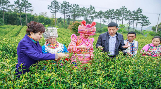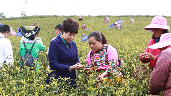 “我們能富起來,是黨和政府幫扶的結(jié)果。替國家分憂,是我們的責(zé)任。”富起來的宋昌美,念念不忘黨和政府的恩德。2018年4月,溪龍鄉(xiāng)黃杜村書記倡議大家給習(xí)總書記寫信,匯報(bào)村里種植白茶致富情況,并提出捐贈1500萬株“白葉一號”茶苗幫助西部貧困地區(qū)群眾脫貧,她第一個(gè)舉手贊成,立馬認(rèn)領(lǐng)捐贈“白葉一號”扶貧苗80萬株。為解決茶苗“往哪兒種”的問題,她與國務(wù)院扶貧辦一道先后四次赴云貴川湘等地區(qū)考察選址,七天內(nèi)坐了5趟飛機(jī),4趟動車,近50個(gè)小時(shí)汽車。她承諾要種活、種好、種出成效。這些年里,宋昌美共往返三省五縣“白葉一號”種植基地近20趟,手把手教農(nóng)戶基地管理、茶葉采摘、炒制加工、市場銷售等全過程技術(shù)經(jīng)驗(yàn)。在像她這樣“土專家”的不懈幫扶下,受捐地已推廣種植“白葉一號”茶園5萬余畝,茶苗存活率接近90%,2022年三省五縣受捐各村共計(jì)采摘青葉6.5萬余斤,銷售收入770萬元,成功帶動2064戶貧困群眾脫貧增收。
