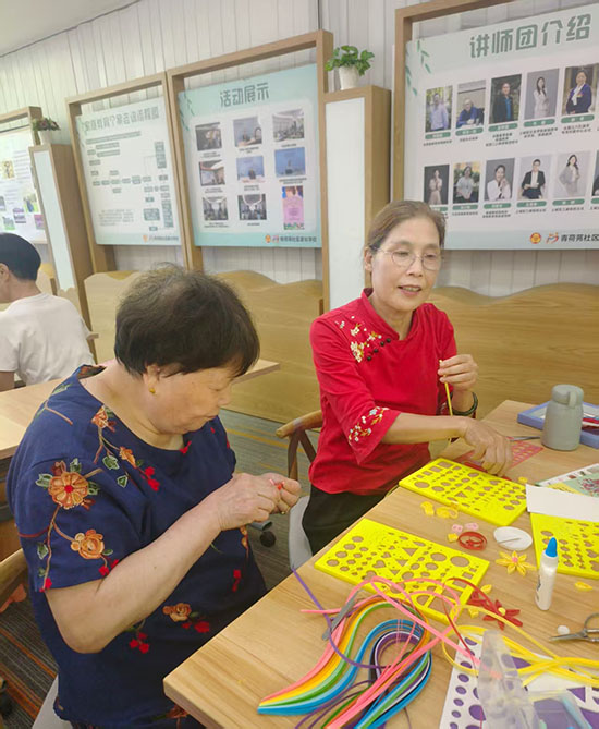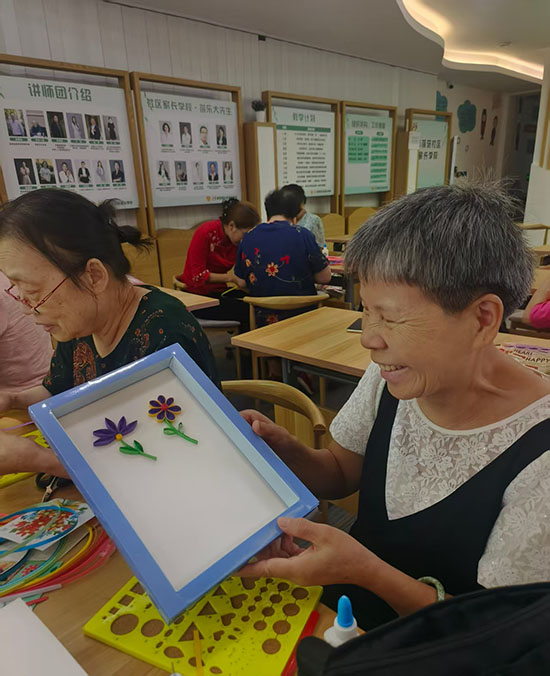 青荷苑社區(qū)曉荷書房里的盤衍紙課堂上,氣氛同樣熱烈。上城區(qū)社區(qū)好老師葉莉囡老師細致講解著盤衍紙的卷曲、粘貼技巧,展示著精致的成品。老人們小心翼翼地拿著衍紙筆,將彩色紙條卷成一個個基礎(chǔ)部件,再組合粘貼成花朵造型。“這活兒看著簡單,實則要細心,做好了特別有成就感!”邵阿姨舉著剛完成的衍紙作品,興奮地向同伴展示,指尖的溫度讓彩色紙條綻放出別樣光彩。
