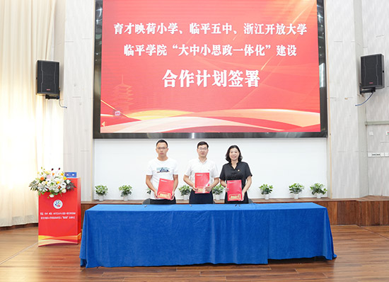 啟動儀式上浙江開放大學臨平學院、臨平第五中學、育才映荷小學主要負責人共同簽署《大中小思政一體化建設合作計劃》,標志著三??鐚W段協(xié)同育人機制進入實質(zhì)性推進階段。