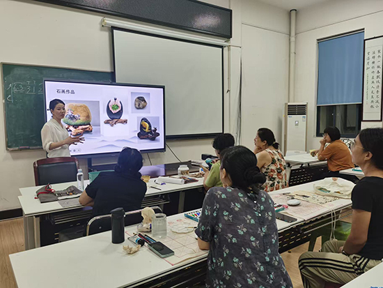 隨后,本次秋季班的授課老師施娟云正式開始第一堂課。施老師以其豐富的石畫創(chuàng)作經(jīng)驗和生動有趣的教學方式,迅速調動起學員們的積極性。她從石畫的基本概念、工具材料的選擇講起,深入淺出地介紹了石畫的創(chuàng)作技巧、構圖原則以及色彩搭配等基礎知識。學員們聽得聚精會神,時而認真記錄,時而低頭思索,對即將開始的動手實踐充滿了期待。