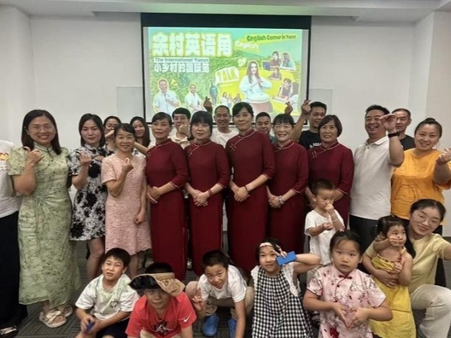 活動(dòng)當(dāng)日,余村的活動(dòng)室內(nèi)氣氛熱烈,投影屏幕上 “余村英語角” “小鄉(xiāng)村的國際范” 等字樣引人注目。參與活動(dòng)的村民涵蓋老中青幼各個(gè)年齡段,大家齊聚一堂,興致勃勃地投入到英語交流與學(xué)習(xí)之中。身著喜慶服飾的村民與天真爛漫的孩子們,共同構(gòu)成了一幅充滿活力與希望的鄉(xiāng)村學(xué)習(xí)圖景。