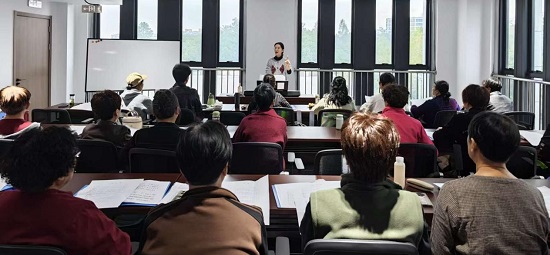 10月21日上午8時不到,安吉社區(qū)教育學(xué)院梅溪分院的聲樂教室內(nèi)已暖意融融。30 余位老年聲樂班學(xué)員手持歌譜,靜待教師丁老師開啟當(dāng)日的《聲聲慢》教學(xué)。?