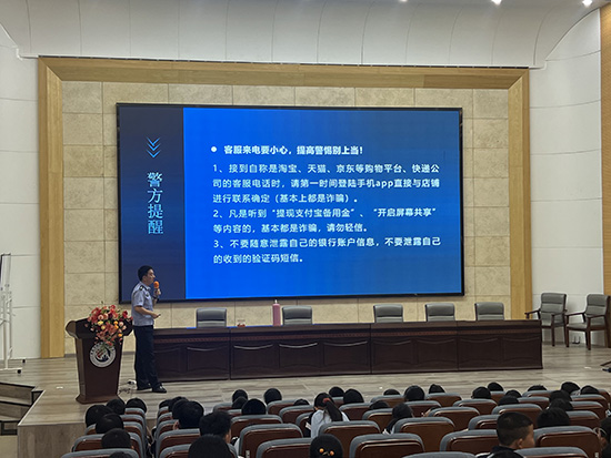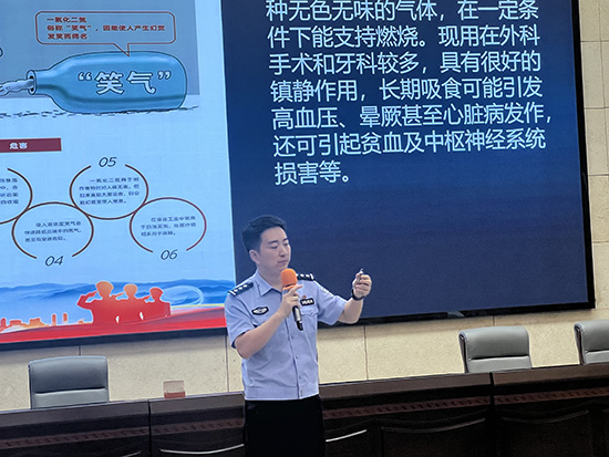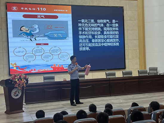 談及預(yù)防電信詐騙,魏警官精準(zhǔn)剖析了學(xué)生群體易遭遇的詐騙套路;而在識(shí)毒禁毒環(huán)節(jié),他更是帶來(lái)派出所近期收繳的“笑氣”實(shí)物樣品現(xiàn)場(chǎng)展示,嚴(yán)肅警示:“這看似是‘娛樂(lè)’用品,實(shí)則是新型陷阱,大家的好奇心絕不能碰觸法律紅線!”整場(chǎng)講座互動(dòng)感十足,鮮活的案例讓每一位學(xué)生都沉浸其中,引發(fā)深度思考。